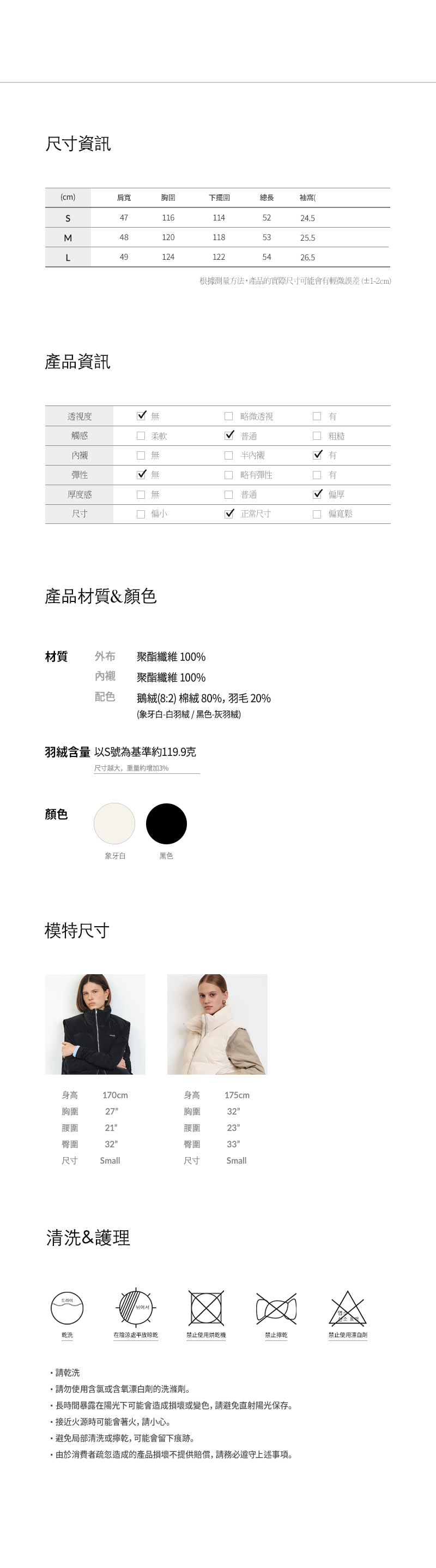背心內部填充了8:2比例的羽絨和羽毛,提供輕盈且保暖的穿著感